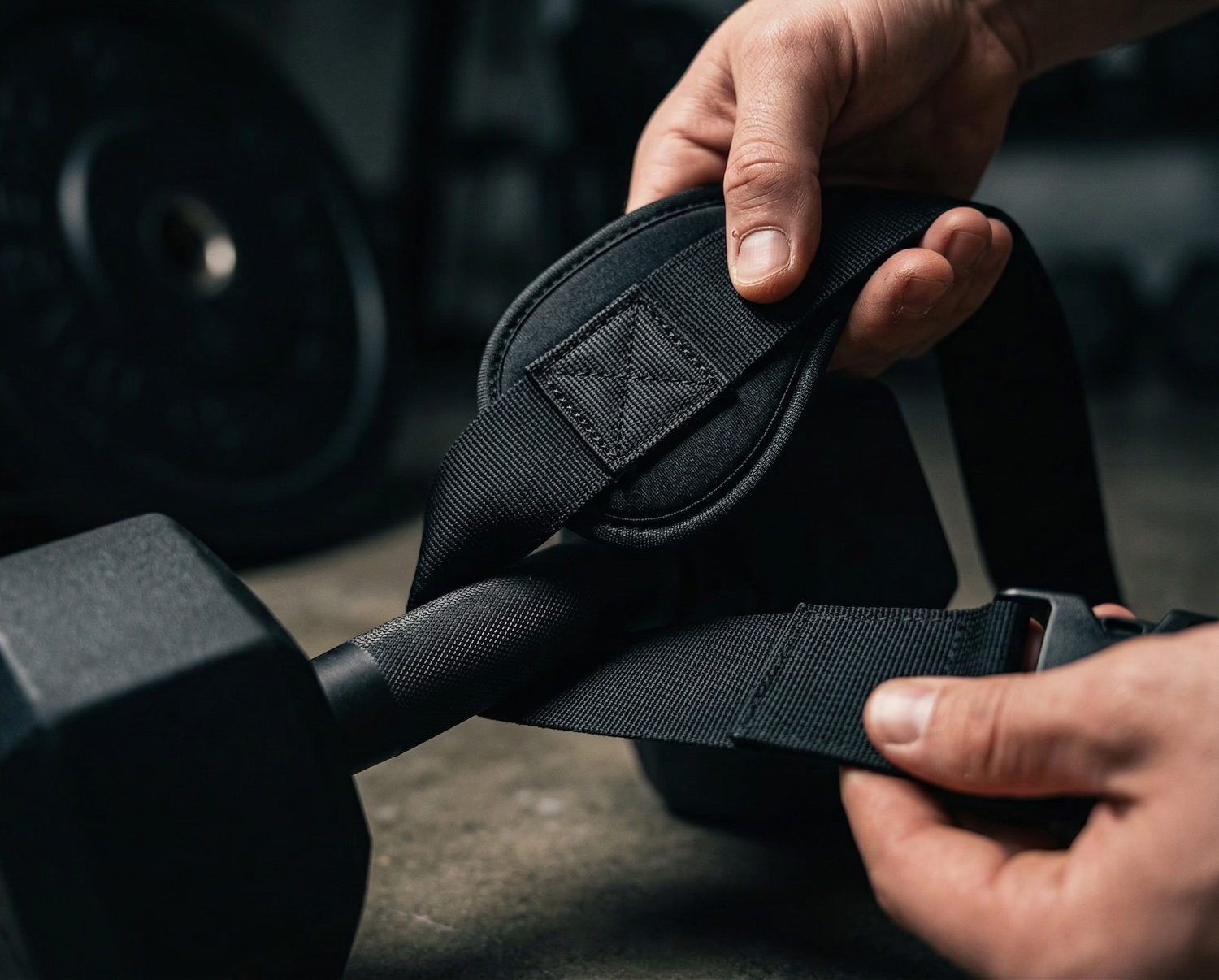 The velcro is industrial grade and uses a dual lock closure system. Customers regularly use 50 to 80 lb dumbbells with zero slipping. The straps wrap around the handle and velcro down, then the padded cover folds over and velcros again for double security. It's not going anywhere.