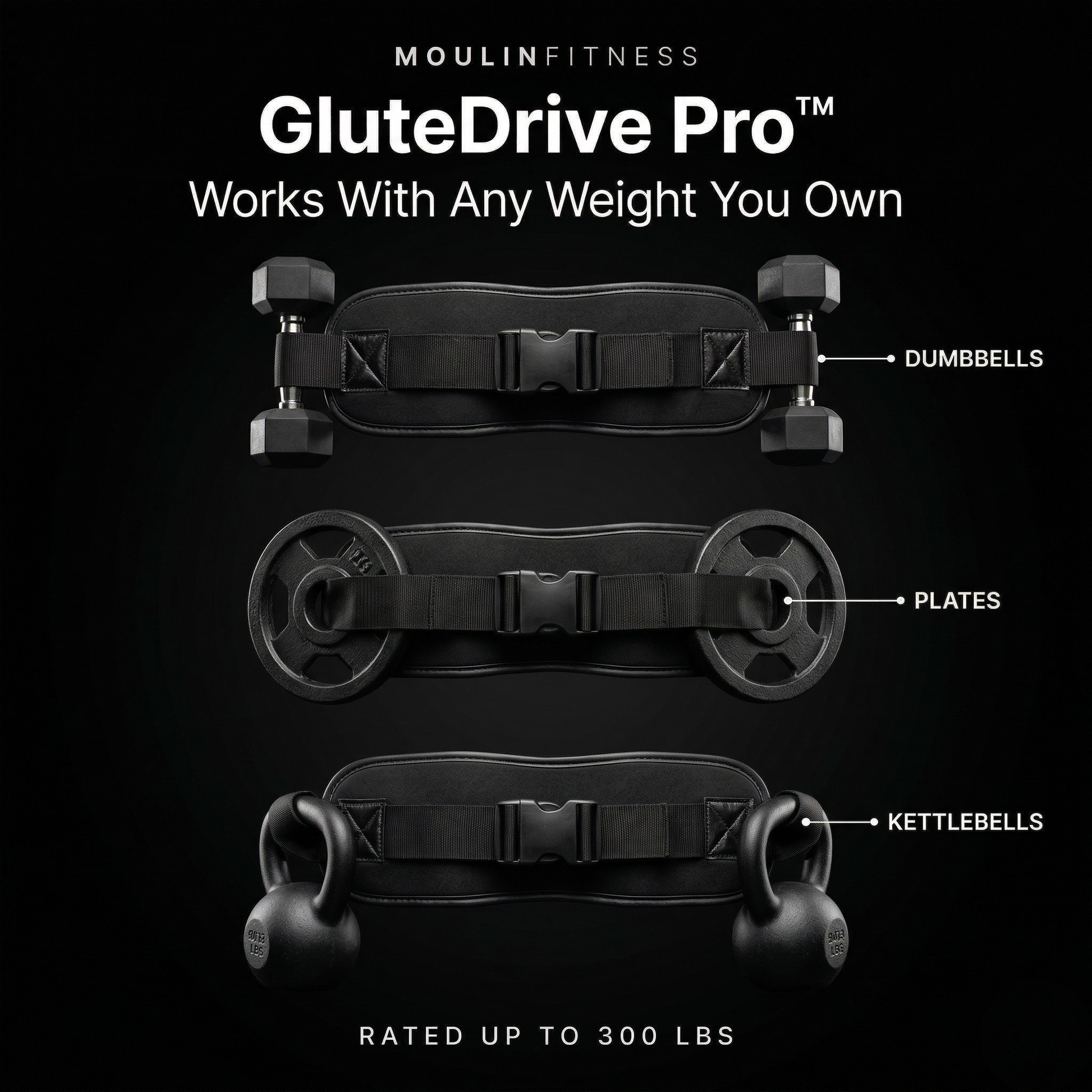 Hip thrusts are just the beginning. Use it for glute bridges, squats, lunges, dips, planks, and more. Compatible with the dumbbells, kettlebells, and plates you already own.
